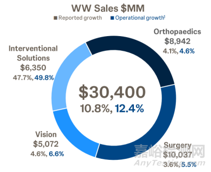 強(qiáng)生醫(yī)療科技全年銷售額304億美元,同比增長(zhǎng)10.8%。銷售額增長(zhǎng)主要得益于介入解決方案領(lǐng)域的電生理產(chǎn)品、視力領(lǐng)域的隱形眼鏡、普通外科領(lǐng)域的傷口閉合產(chǎn)品和高級(jí)外科領(lǐng)域的生物外科產(chǎn)品。