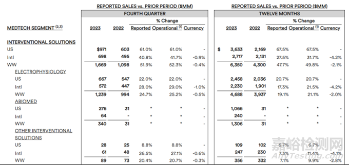 在增長(zhǎng)最強(qiáng)勁的介入解決方案板塊中,電生理業(yè)務(wù)取得亮眼表現(xiàn),成為強(qiáng)生醫(yī)療科技今年各細(xì)分業(yè)務(wù)中增長(zhǎng)最顯著的部分,全年銷售額達(dá)到46.88億美元,同比增長(zhǎng)19.1%。此外,強(qiáng)生于2022年12月收購人工心臟巨頭Abiomed,這部分業(yè)務(wù)帶來13.06億美元的銷售額。