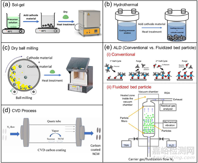 溶膠凝膠包覆工藝通常用于合成正極材料以及表面包覆。然而,由于使用水或其他溶劑,增加了成本。另外水之類的溶劑會(huì)導(dǎo)致鋰浸出并改變正極表面化學(xué)計(jì)量。