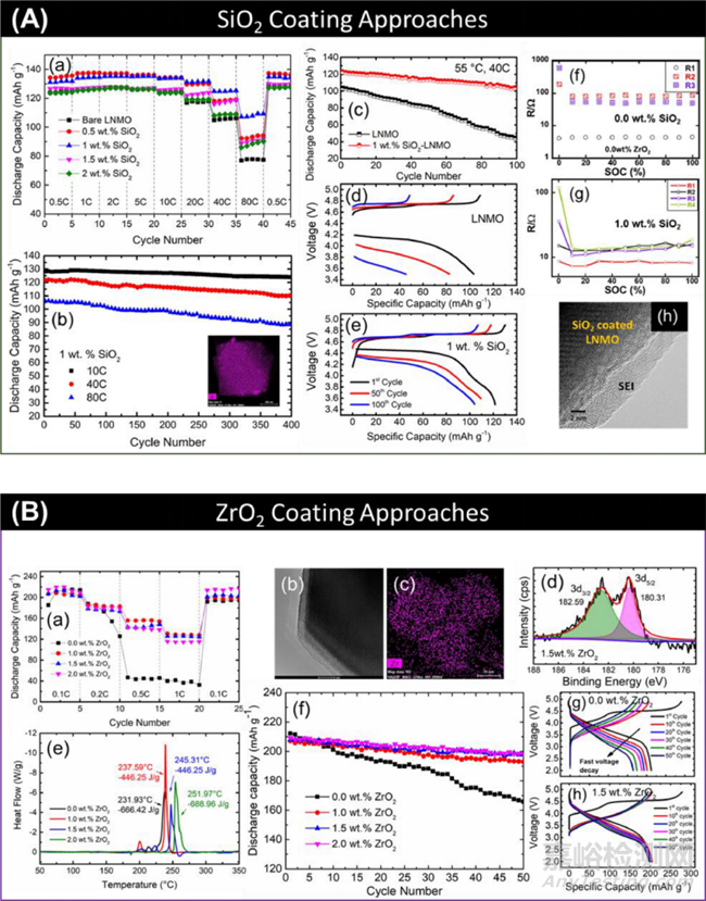 圖4、(A)SiO2包覆LNMO電化學(xué)性能(B)ZrO2包覆(NCM)材料電化學(xué)性能。