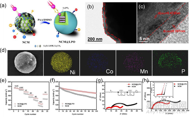 圖5、Li3PO4(LPO)修飾LiNi0.8Co0.1Mn0.1O2(NCM)