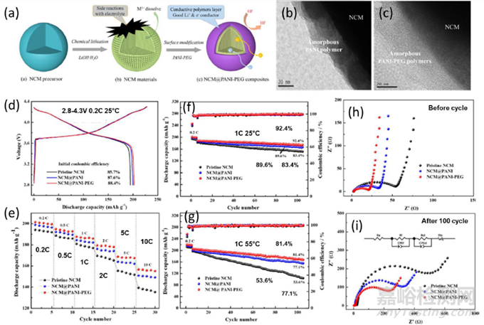圖8、NCM@PANI-PEG復(fù)合包覆層示意圖及其電化學(xué)性能