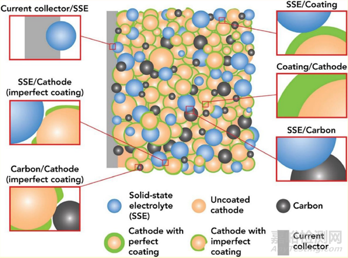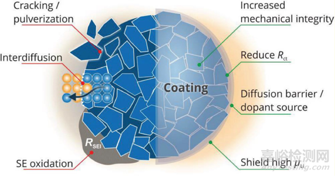 包覆層應(yīng)均勻且完全覆蓋正極顆粒,并保證正極顆粒之間的接觸以提供導(dǎo)電網(wǎng)絡(luò)。硬而脆的包覆層在電極制造過(guò)程中易形成裂紋,因此形成顆粒接觸,但可能導(dǎo)致SE分解。如果包覆層是塑性且可變形,則它可以通過(guò)變形而形成新的接觸點(diǎn)而不會(huì)形成裂紋。表面包覆應(yīng)抑制或適應(yīng)正極材料的體積變化,以保持顆粒間的接觸。另外,正極活性材料和SE之間也可能相互擴(kuò)散。包覆會(huì)抑制這種相互擴(kuò)散,減輕電阻性界面的形成。