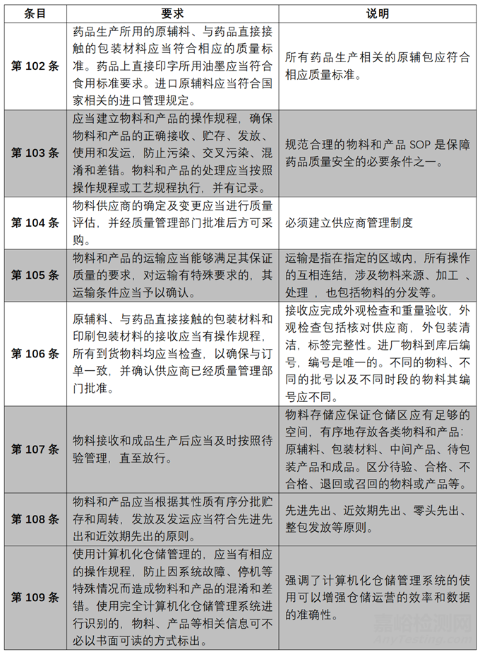 在我國(guó)2011年版藥品生產(chǎn)質(zhì)量管理規(guī)范中,第六章 物料與產(chǎn)品,第一節(jié) 原則:第102條到109條相關(guān)描述中,明確指出了對(duì)于物料管理的基本原則。明確指出了對(duì)于物料管理的基本要求和原則,涉及從接收到放行過(guò)程的內(nèi)容主要是第103條、105條、107-109條(見表1:灰色區(qū)域)。第103條:從合規(guī)實(shí)施的角度,要求企業(yè)應(yīng)當(dāng)建立物料和產(chǎn)品的操作規(guī)程,確保物料和產(chǎn)品的正確接收、貯存、發(fā)放、使用和發(fā)運(yùn),防止污染、交叉污染、混淆和差錯(cuò);第105條:關(guān)于物料的正確運(yùn)輸要求,側(cè)重于從物料運(yùn)輸屬性(廠區(qū)內(nèi)/外、潔凈/非潔凈區(qū)、特殊/非特殊物料等)角度,防止和減小風(fēng)險(xiǎn),并制定控制策略;第107條至第109條:分別關(guān)于物料接收、待驗(yàn)和倉(cāng)儲(chǔ)管理等要求。