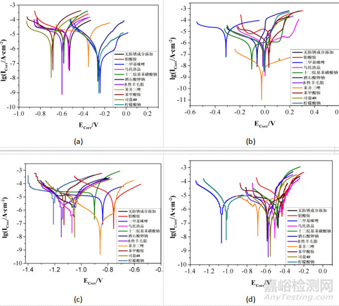 圖 6 Q235(a)、銅(b)、鋅(c)、鋁(d)在不同藥品中的極化曲線