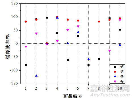 鋼(Q235)、銅、鋅、鋁在大氣腐蝕模擬液中浸泡7天后的腐蝕速率圖分別為圖1~圖4,圖中黑色虛線表示增重/失重腐蝕速率分界線,紅色虛線表示無防銹成分腐蝕速率,介于紅線之間即為正向緩蝕,紅線之外即為反向緩蝕(即加速腐蝕),由圖1可以看出編號2、3、4、5、7、9的藥品對鋼(Q235)具有良好的緩蝕作用,其他編號(6和8)的藥品對鋼(Q235)幾乎無作用效果,編號1和10的藥品甚至加速鋼腐蝕。圖2可以看出所有藥品均對銅具有正向防銹作用。圖3可以看出編號1、4、5、6、8、10的藥品對鋅具有正向防銹作用。圖4可以看出除了編號3、5的藥品外,其他藥品對鋁均勻正向防銹作用。圖5為鋼(Q235)、銅、鋅、鋁不同藥品浸泡7天后緩蝕效率圖,由圖5可看出編號2(酒石酸鉀鈉)、4(苯丙三唑)、6(水溶性羊毛脂)、8(十二烷基苯丙磺酸鈉)的藥品對四種金屬都具有正向緩蝕效果。