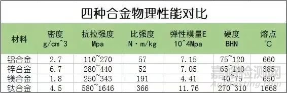 但就產(chǎn)品結(jié)構(gòu)設(shè)計(jì)而言,還需要考慮重量,如果將比重考慮進(jìn)去,鋅合金由于密度最大,比強(qiáng)度反而最小。鈦合金和鎂合金比強(qiáng)度高,但鈦合金價(jià)格昂貴,加工性能不好,因此在需要綜合考慮重量和強(qiáng)度的結(jié)構(gòu)件中,多采用鎂合金。