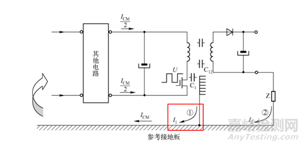 第二種共模電流是由開關電源的初級du/dt 電路與次級電路(C12)? 次級電路與參考接地板之間的容性耦合(Z)造成的, 即如下圖所示的 I2 ?