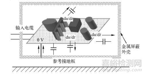 由此可見, 當開關電源采用金屬屏蔽外殼時, 由于開關電源的du/dt干擾源與金屬屏蔽外殼之間總是要先于參考接地板產生容性耦合。