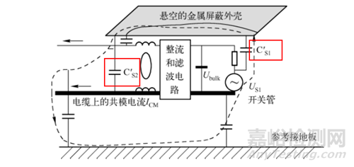 而當存在金屬外殼時, 由于金屬板的存在, 使干擾信號所在點 (開關管) 與開關電源輸入電源線之間的寄生電容等于下圖C′S1與 C′S2的并聯(lián)?