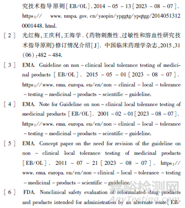 2014年原國家食品藥品監(jiān)督管理總局(China Food and Drug Administration,CFDA)發(fā)布了《藥物刺激性、過敏性和溶血性研究技術(shù)指導(dǎo)原則》[1] ,該指導(dǎo)原則是目前國內(nèi)針對(duì)藥物制劑安全性試驗(yàn)的主要參考指導(dǎo)原則,是在2005年CFDA 發(fā)布的《化學(xué)藥物刺激性、過敏性和溶血性研究技術(shù)指導(dǎo)原則》《中藥、天然藥物刺激性和溶血性研究的技術(shù)指導(dǎo)原則》基礎(chǔ)上的合并修訂版,同時(shí)參考了美國食品藥品監(jiān)督管理局(Food and Drug Administration,F(xiàn)DA)、歐洲藥品管理局(European Medicines Agency,EMA)、美國環(huán)境保護(hù)署(Environmental Protection Agency,EPA)、國際標(biāo)準(zhǔn)化組織(International Organization for Standardization,ISO)、經(jīng)濟(jì)合作與發(fā)展組織(Organisation for Economic Cooperation Development, OECD)及日本厚生省等機(jī)構(gòu)的相關(guān)指導(dǎo)原則[2] 。在該指導(dǎo)原則基礎(chǔ)內(nèi)容中詳細(xì)列舉了受試物、實(shí)驗(yàn)動(dòng)物、溶血性試驗(yàn)、過敏性試驗(yàn)、刺激性試驗(yàn)、光毒性試驗(yàn)、結(jié)果分析及常見問題處理,并收載了常用的試驗(yàn)方法,對(duì)于指導(dǎo)藥品研發(fā)單位及注冊(cè)申請(qǐng)人開展相關(guān)研究具有重要參考價(jià)值。