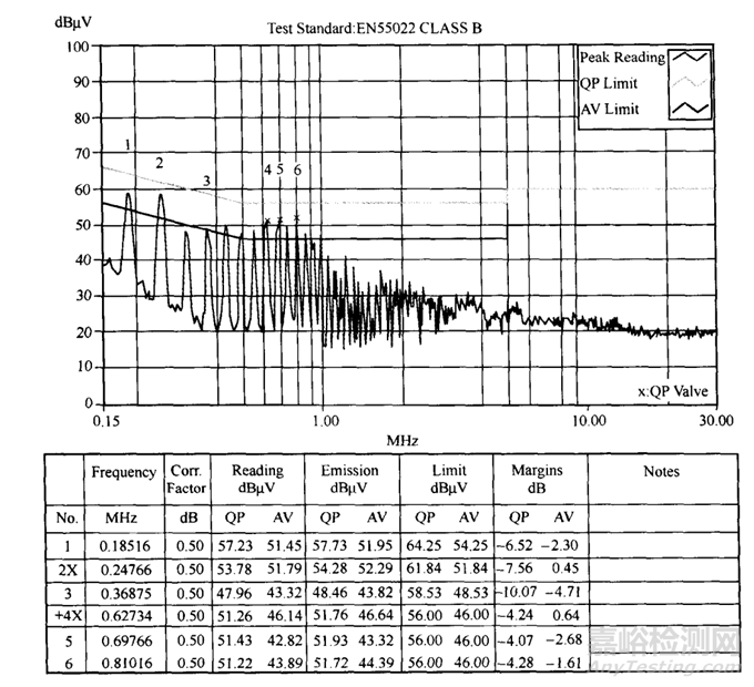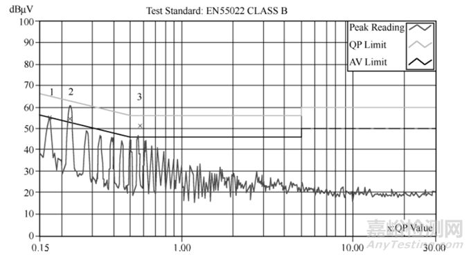 某充電器產品在進行電源端口的傳導騷擾測試時,發(fā)現測試結果超過EN55022標準中規(guī)定的 CLASS B限值,其幅頻曲線如下圖所示: