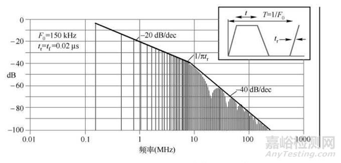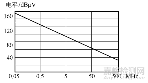 基頻的諧波信號產品的諧波電平幅度隨頻率的關系如下圖所示,這些諧波電平會傳遞到電源線上形成傳導騷擾,從前面測試超標的頻譜圖也正好驗證了超標的頻點來自于開關電源。