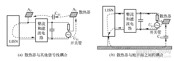 散熱器面積一般較大,容易與PCB中的信號線、器件、電源線、地平面等形成較大的寄生電容,從而成為傳導騷擾的關鍵路徑。