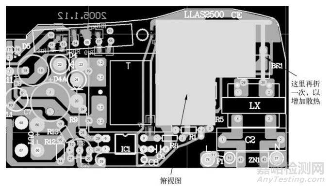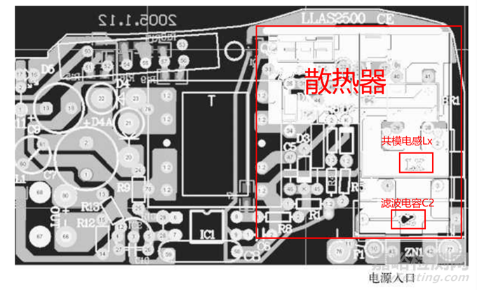 在本案例中,雖然散熱器已經接了功能地,但是從下圖中可以發(fā)現,散熱器的面積比較大,并一直延伸到電源入口處,并覆蓋了電源輸入端共模電感Lx以及濾波電容C2。