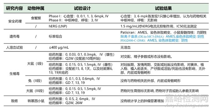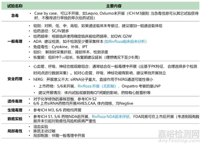 根據(jù)已上市的6款siRNA藥物申報資料,臨床前開展的安全性評價試驗總結(jié)如表2。