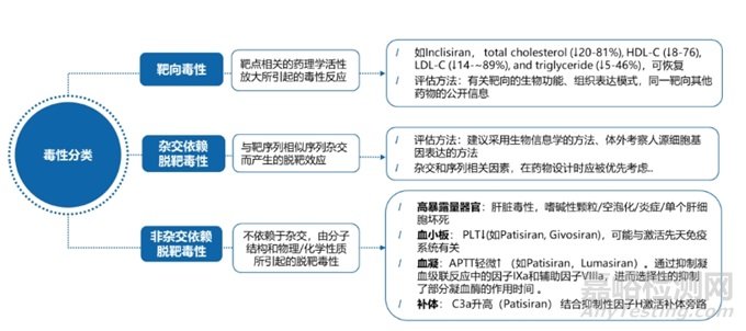 理論上講,若siRNA和靶mRNA準(zhǔn)確地結(jié)合在一起,則可成功的沉默靶基因。然而,許多siRNA都存在脫靶,并且大多數(shù)siRNA分子可能并不具有靶向性。siRNA的引入可導(dǎo)致脫靶效應(yīng),即抑制目標(biāo)基因以外的其他基因,導(dǎo)致非靶基因表達(dá)突變的意外后果。根據(jù)日本藥品醫(yī)療器械管理局(PMDA)發(fā)布的《寡核苷酸治療產(chǎn)品非臨床安全性評價指導(dǎo)原則》,寡核苷酸的毒性分析分為靶向毒性、脫靶毒性,詳細(xì)見圖3。