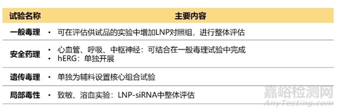 除了關(guān)注siRNA藥物本身外,還要關(guān)注遞送系統(tǒng)毒性,如LNP。LNP含有新的輔料,或成分比例發(fā)生了改變,需要對LNP進行考察。雖然沒有專門針對LNP的指導(dǎo)原則,但可以參考相關(guān)指導(dǎo)原則,如《新藥用輔料非臨床安全性評價指導(dǎo)原則》、《納米藥物非臨床安全性研究技術(shù)指導(dǎo)原則》、《Guidance for Industry : Liposome Drug Products Chemistry, Manufacturing, and Controls; Human Pharmacokinetics and Bioavailability; and Labeling Documentation》等。此外,還可以參考Patisiran關(guān)于LNP的考察。若LNP是按非單獨輔料注冊標(biāo)準(zhǔn)申報,且考慮到siRNA需要兩種動物種屬,可按與非臨床安全性評價中相同的動物種屬伴隨或單獨考察LNP。IND申報LNP需要開展的毒理試驗推薦見表7。