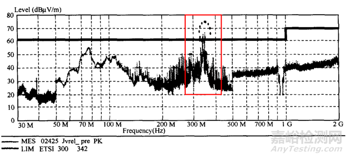 圖中粗折線為標(biāo)準(zhǔn)限值曲線,用近場探頭進(jìn)行定位測試,最終確認(rèn)是其中一模塊與背板之間的接插處輻射泄漏導(dǎo)致, 該頻率點的源頭是模塊內(nèi)部PCB中的50MHz(其7次諧波為350MHz)晶振。