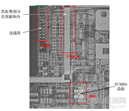 這不僅會破壞晶振下方完整的地平面,而且必然會將50MHz晶振產(chǎn)生的噪聲通過容性耦合的方式耦合到穿過它下面的信號線,從而使得這些信號線帶有共模電壓噪聲,而這些信號線又延伸出了PCB上的屏蔽體,這樣會將噪聲帶出屏蔽體。
