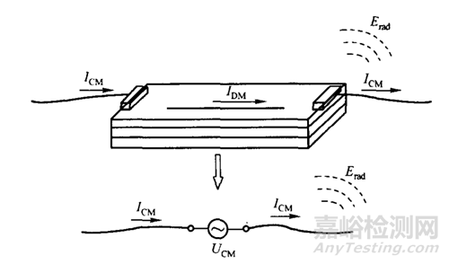 差模電流IDM在信號線下面的參考平面上會產(chǎn)生一個共模電壓降UCM,UCM激勵與之連接的信號線,從而形成輻射 。