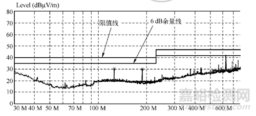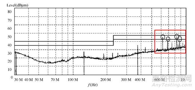 在進(jìn)行輻射測(cè)試時(shí),有幾個(gè)頻點(diǎn)(625 MHz? 687.5 MHz? 812.5 MHz? 875 MHz)超標(biāo),不能滿足CLASS B限值要求,其測(cè)試得到的頻譜圖如下: