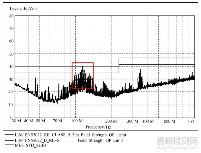 某產品為居住環(huán)境所用產品,輻射發(fā)射必須要求符合EN55022的 CLASS B限值。測試時發(fā)現,在120MHz附近有多個超標的頻點,其幅頻曲線如下圖所示: