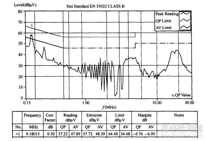 對該開關(guān)電源進(jìn)行輻射發(fā)射和傳導(dǎo)騷擾測試,可以順利通過EN55022標(biāo)準(zhǔn)中規(guī)定的 CLASSB的限值要求,其測試幅頻曲線如下所示: