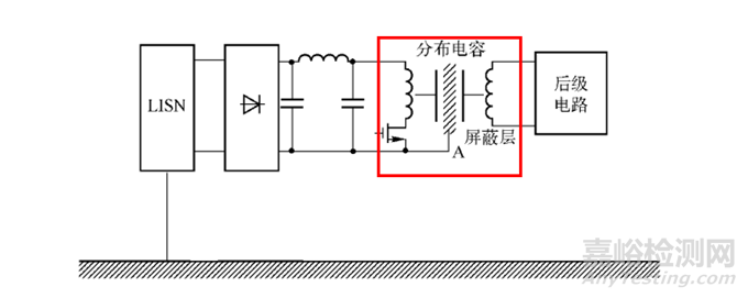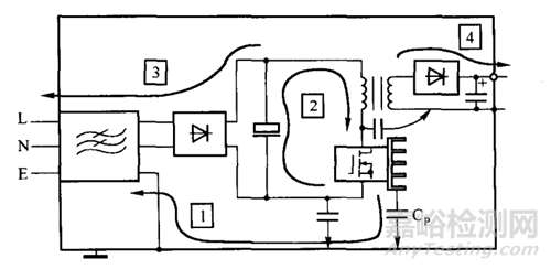 開關(guān)電路是開關(guān)電源的核心,主要由功率開關(guān)管和高頻變壓器組成。功率管開關(guān)時(shí)產(chǎn)生較大輻度的脈沖(類似PWM波), 這種波形頻帶較寬且有豐富的諧波。其騷擾傳播示意圖如下圖所示: