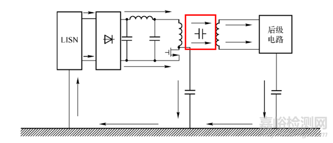 變壓器的初、次級之間存在分布電容, 使得初級回路中產(chǎn)生的騷擾向次級回路傳遞,如下圖所示: