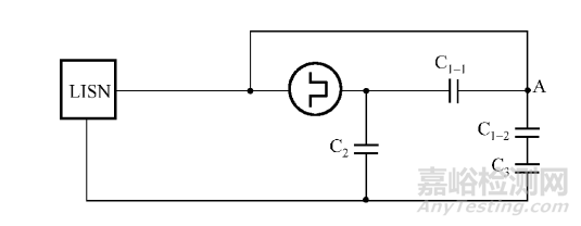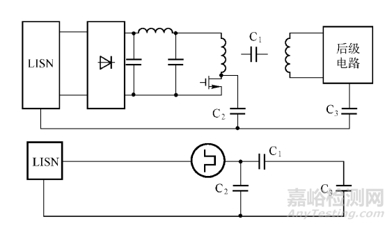 在圖中可以看出,這種分布電容一方面會(huì)加大騷擾的傳遞路徑,還會(huì)使得LISN接收到更多的電流,使得傳導(dǎo)騷擾測試超過限值。上圖的等效電路如下圖所示: