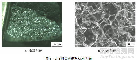 通常氫脆、應(yīng)力腐蝕、液態(tài)金屬致脆、過(guò)燒及回火脆性引起的斷口大多呈沿晶斷裂特征。顯微組織未見(jiàn)過(guò)燒現(xiàn)象,排除過(guò)燒問(wèn)題;斷口表面未見(jiàn)腐蝕形貌,排除應(yīng)力腐蝕的影響;錐形墊圈和螺母表面的處理方式均為達(dá)克羅處理,不存在低熔點(diǎn)金屬,如鎘等,排除液態(tài)金屬致脆原因;墊圈斷口晶面未見(jiàn)雞爪痕和撕裂棱等典型氫脆特征,同時(shí)墊圈表面處理方式為達(dá)克羅,未進(jìn)行電鍍處理,可排除氫脆影響。常規(guī)檢測(cè)手段難以判斷回火脆性,人工打斷斷口分析對(duì)回火脆性判斷至關(guān)重要。為進(jìn)一步確認(rèn)斷裂錐形墊圈是否存在回火脆性,人工打斷同批完好墊圈,觀察其斷口形貌是否與斷裂墊圈一致。人工斷口宏觀形貌和SEM形貌如圖4所示。