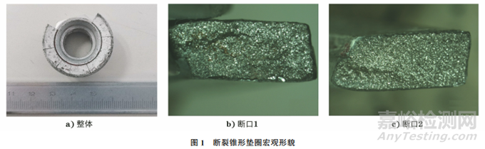 從多件斷裂的錐形墊圈中隨機(jī)選取1件墊圈,該墊圈宏觀形貌如圖1所示。