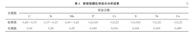 在錐形墊圈斷口附近取樣,去掉達(dá)克羅涂層后對(duì)試樣進(jìn)行化學(xué)成分分析,采用碳硫儀分析C、S元素,用光譜儀分析其余元素,結(jié)果如表1所示。由表1可知:斷裂墊圈的化學(xué)成分符合 GB/T 1222—2007《彈簧鋼》的要求。