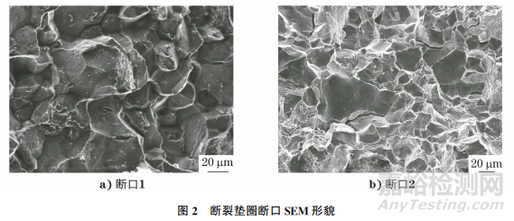 人工打斷斷口宏觀存在大量閃光小刻面,微觀可見(jiàn)大量沿晶+少量韌窩+少量二次裂紋,晶面干凈,未見(jiàn)雞爪痕及撕裂棱,與裝配斷裂墊圈斷口形貌一致,因此判定該批錐形墊圈存在回火脆性,導(dǎo)致安裝斷裂。