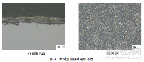 在斷口處取樣,依據(jù)GB/T 13298—2015《金屬顯微組織檢驗(yàn)方法》制備金相試樣,經(jīng)鑲嵌、磨制及拋光后,選用體積分?jǐn)?shù)為4%的硝酸乙醇溶液腐蝕試樣,將金相試樣置于光學(xué)顯微鏡下觀察,結(jié)果如圖3所示。由圖3可知:墊圈表面存在多條顯微裂紋,深度約為0.007mm,未見(jiàn)對(duì)力學(xué)性能影響較大的非金屬夾雜物,顯微組織為回火屈氏體,未見(jiàn)過(guò)熱過(guò)燒、脫碳等缺陷。