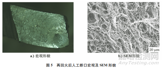 再回火后該批墊圈硬度降至476HV,換算成洛氏硬度為47.5HRC,滿足該批錐形墊圈標(biāo)準(zhǔn)值42~50HRC的要求。再回火后人工斷口宏觀及SEM形貌如圖5所示。由圖5可知:再回火后人工斷口為灰白色,未見(jiàn)明顯亮刻面,微觀主要為韌窩形貌,消除了沿晶特征。