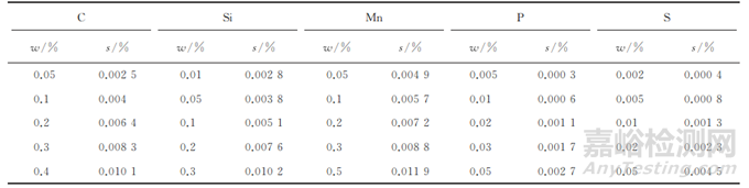 根據(jù)GB/T 4336—2016(包含國家標準第1號修改單XG1—2017)和T/CSTM 00010.2—2017中精密度的r計算公式,將各元素相應含量段的r直接轉換成標準偏差(s),得到鋼鐵成分重復性分析誤差(部分元素的重復性分析誤差見表1)。