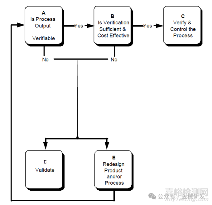 每個(gè)過程都應(yīng)該有一個(gè)描述過程參數(shù)和期望輸出的規(guī)范。制造商應(yīng)考慮輸出是否可以通過后續(xù)的監(jiān)視或測量進(jìn)行驗(yàn)證(A)。如果答案是肯定的,則應(yīng)考慮單獨(dú)驗(yàn)證是否足以消除不可接受的風(fēng)險(xiǎn),并且是一種具有成本效益的解決方案(B)。如果是,則應(yīng)驗(yàn)證輸出并對(duì)過程進(jìn)行適當(dāng)控制(C)。