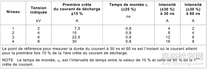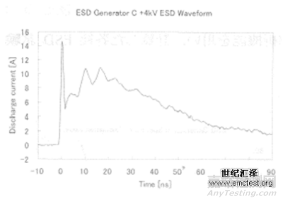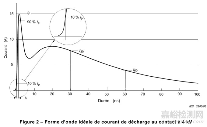 靜電放電電流波形的規(guī)定,主要的四個(gè)關(guān)鍵指標(biāo)為:首次峰值電流Ip;上升時(shí)間Tr;30ns時(shí)的電流值I30;60ns時(shí)的電流值I60。從上表中可以看出這四個(gè)指標(biāo)的容許偏差都較大,首次峰值電流Ip為±15%,上升時(shí)間Tr為±25%,30ns時(shí)的電流值I30為±30%,60ns時(shí)的電流值I60為±30% 。