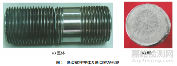 國內(nèi)某核電廠安全噴淋泵外筒體與底板連接螺柱在安裝完成20h后斷裂。該螺柱材料為X6CrNiCu17-04時效硬化馬氏體鋼雙頭螺柱,規(guī)格為M36×110mm。該批螺柱按規(guī)定進行了固溶加時效處理,其中固溶溫度為1050℃,保溫時間為4h,油冷;時效硬化處理溫度為(610±5)℃,保溫時間為4h,空冷。固溶、時效硬化溫度曲線均符合規(guī)范要求。研究人員采用宏觀觀察、化學(xué)成分分析、力學(xué)性能測試、金相檢驗、掃描電鏡(SEM)和能譜分析等方法對該螺柱的斷裂原因進行分析,以防止該類問題再次發(fā)生。
