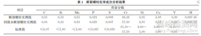 采用ICP-AES型電感耦合等離子體原子發(fā)射光譜儀對斷裂螺柱進行化學(xué)成分分析,結(jié)果如表1所示。其中采用惰性氣體熔融熱導(dǎo)法測量氫元素,從螺栓上取約1g試樣,浸在四氯化碳溶液中,之后用超聲波清洗試樣,風(fēng)干后將試樣放入經(jīng)脫氣的石墨坩堝中,在質(zhì)量分數(shù)為99.99%以上的氬氣保護下加熱熔融,釋放出的氫氣分子進入載流氣體中,經(jīng)色譜柱與氣體分離后,在熱導(dǎo)池中進行檢測,根據(jù)熱導(dǎo)率的信號變化,計算出氫含量。由表1可知:該批螺柱的化學(xué)成分均符合RCC-M M5110《壓水堆核島機械設(shè)備設(shè)計和建造規(guī)則》的要求,尤其是S、P等有害雜質(zhì)元素的含量均滿足標準要求,但氫含量較高,斷裂螺柱中H的質(zhì)量分數(shù)達到了0.00046%,明顯偏高,也顯著高于未斷裂螺柱中氫的質(zhì)量分數(shù)。
