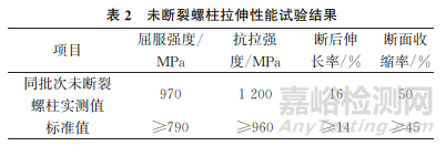 選取同批次未斷裂螺柱進行室溫拉伸試驗,加載位移速率為2mm/min,試驗精度為±0.5%。同批次試樣的室溫拉伸試驗結(jié)果如表2所示。由表2可知:同批次試樣室溫抗拉強度和屈服強度滿足RCC-M M5110標準對X6CrNiCu17-04鋼材料的要求,其中屈服強度和抗拉強度較高,分別達到了970MPa和1200MPa,斷后伸長率和斷面收縮率滿足標準要求,但裕度不大。