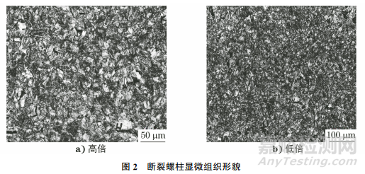 依據(jù)GB/T 13299—1991 《鋼的顯微組織評定方法》及GB/T 10561—2005《鋼中非金屬夾雜物含量的測定 標準評級圖顯微檢驗法》在斷裂螺柱上分別取樣,將試樣置于光學(xué)顯微鏡下觀察,結(jié)果如圖2所示。