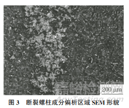 進一步對斷裂螺柱金相試樣進行掃描電鏡及能譜分析,斷裂螺柱存在較為明顯的成分偏析帶,結(jié)果如圖3所示。