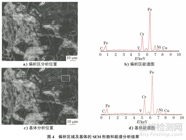 對偏析帶和基體分別進行能譜分析,結(jié)果如圖4所示。由圖4可知:成分偏析區(qū)域除C元素含量明顯比基體高,其他主元素含量與基體相當(dāng)。