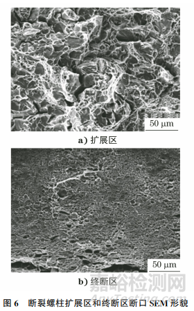 由圖6可知:斷口擴展區(qū)以沿晶斷裂為主,并有少量韌窩;終斷區(qū)呈韌窩個別撕裂特征,面積非常小,該斷口呈典型的脆性斷裂特征。
