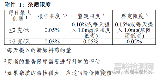 ICH Q3A和Q3B對(duì)非基因毒性雜質(zhì)在原料藥(DS)和制劑(DP)中的限度進(jìn)行了規(guī)定。其中很重要的一個(gè)概念是界定限,低于該限度則可視為不會(huì)產(chǎn)生額外毒性。比如,如果一個(gè)藥物每日最大劑量≤2g,DS中非基因毒性雜質(zhì)的界定限度為1mg/天或0.15%,哪個(gè)數(shù)值小則以哪個(gè)為準(zhǔn)。比如,某藥物臨床每日最大劑量為1.5g/天,按照0.15%界定限度計(jì)算,則雜質(zhì)攝入的絕對(duì)量為2.25mg,超過1mg,則取限度更低的1mg設(shè)定限度,1mg÷1.5g×100%=0.07%。如果超出這一限度,且無更多數(shù)據(jù)可判定該雜質(zhì)的安全性,則需要開展非臨床研究確定其潛在風(fēng)險(xiǎn)。ICH Q3A中關(guān)于雜質(zhì)限度的示例如下: