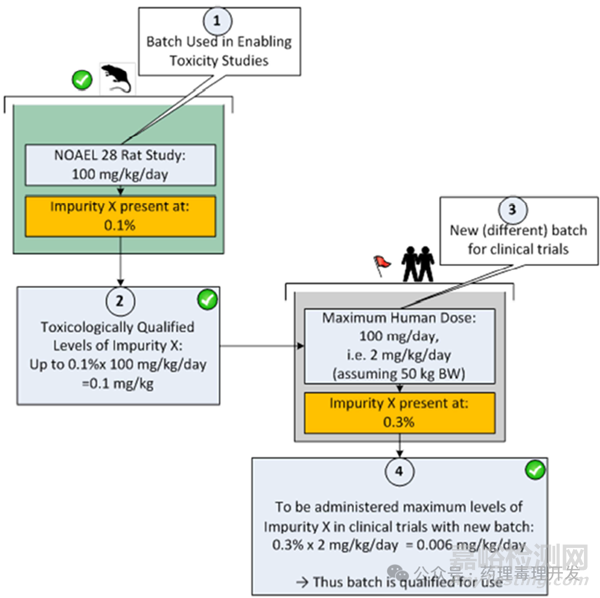2)基于非臨床研究毒理學(xué)數(shù)據(jù)和預(yù)期臨床每日最大用量進(jìn)行計(jì)算,如下圖所示。這種方法比較常用一些。先根據(jù)非臨床動(dòng)物毒理研究的NOAEL及雜質(zhì)含量,確定雜質(zhì)的NOAEL劑量。再計(jì)算臨床新批次的雜質(zhì)含量在臨床最大擬用劑量下的雜質(zhì)劑量。如果臨床新批次樣品計(jì)算出的劑量小于非臨床雜質(zhì)NOAEL水平,那下圖中的0.3%的新批次限度也是可以接受的。如果像腫瘤產(chǎn)品無法確定NOAEL,可根據(jù)具體情況選擇LOAEL、STD10或HNSTD來進(jìn)行計(jì)算。