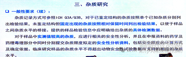 2023年4月26日,CDE姚方耀老師分享了《新藥臨床試驗(yàn)申請(qǐng)前藥學(xué)溝通交流技術(shù)要求及案例分析》這一主題,在雜質(zhì)研究部分有提到對(duì)于實(shí)測(cè)值較高的雜質(zhì),需要基于藥理毒理研究數(shù)據(jù)提供計(jì)算方式和依據(jù)。